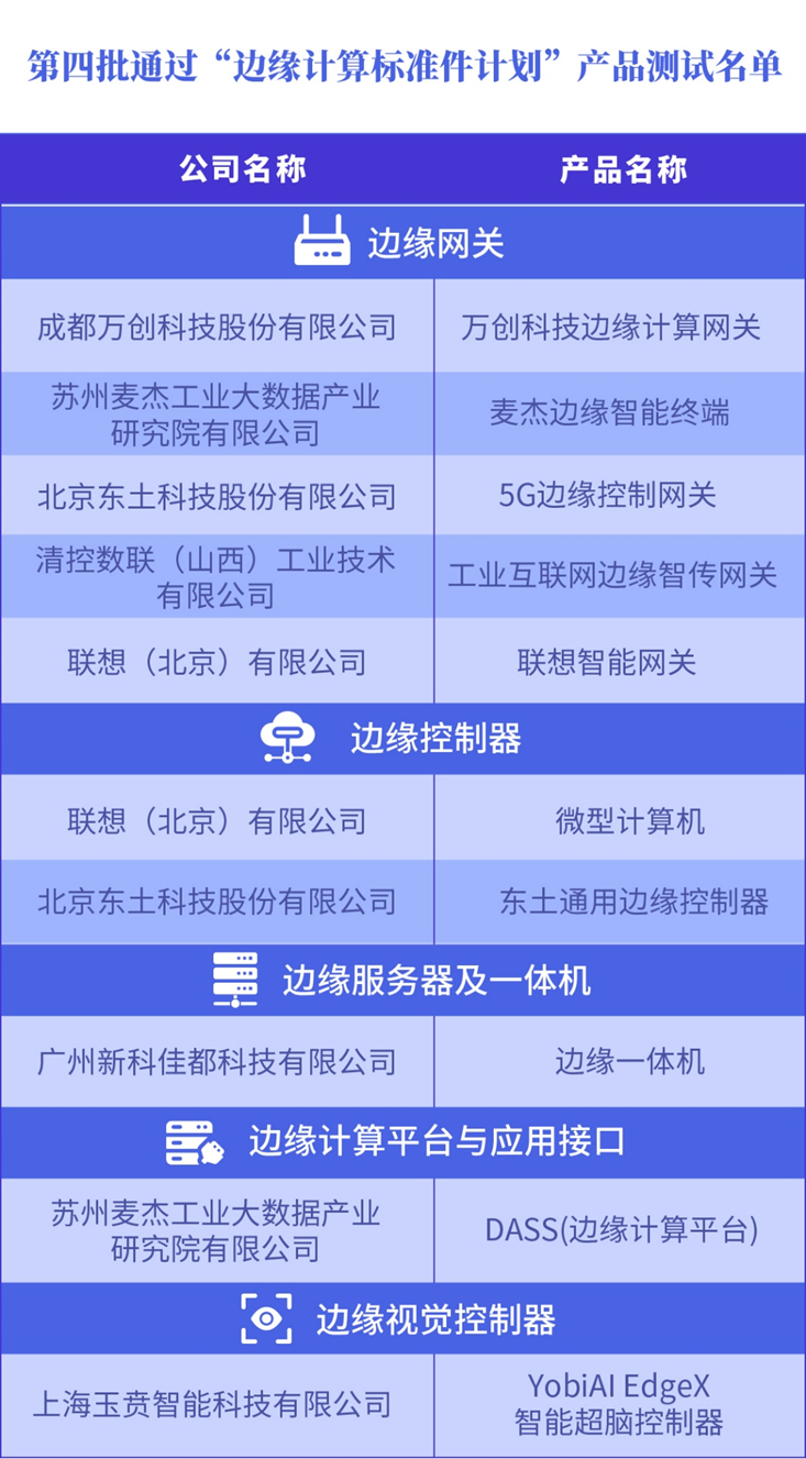 隨后,論壇公布了第四批“邊緣計算標準件計劃”測試結果。來自聯想、東土科技、麥杰科技、玉賁智能、清控數聯、萬創科技、佳都科技等企業的產品順利通過第四批“邊緣計算標準件計劃”測試。