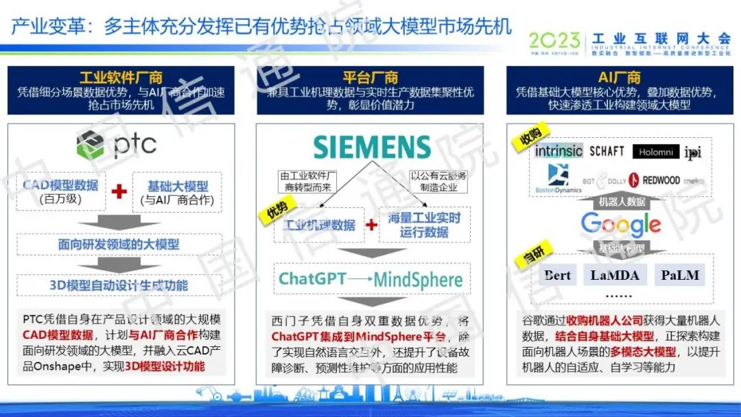 在領域大模型生態中,工業軟件廠商憑借細分場景數據優勢,通過與AI廠商合作加速搶占市場先機;平臺企業具備工業機理與實時生產數據雙重優勢,將彰顯巨大價值潛能;同時,AI廠商已具備基礎大模型技術優勢,再疊加數據優勢,能夠快速滲透工業構建領域大模型。