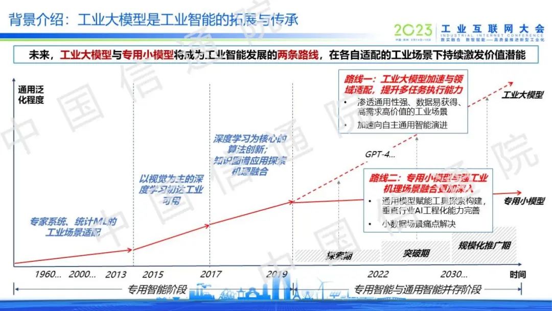 在2019年之前,工業智能還處于專用智能階段。隨著大模型技術的躍遷式發展,工業智能演變出了以工業大模型和專用小模型為主的兩條路線。工業大模型將加速與領域適配,提升多任務的執行能力,專用小模型將與強工業機理環節融合的更加深入。