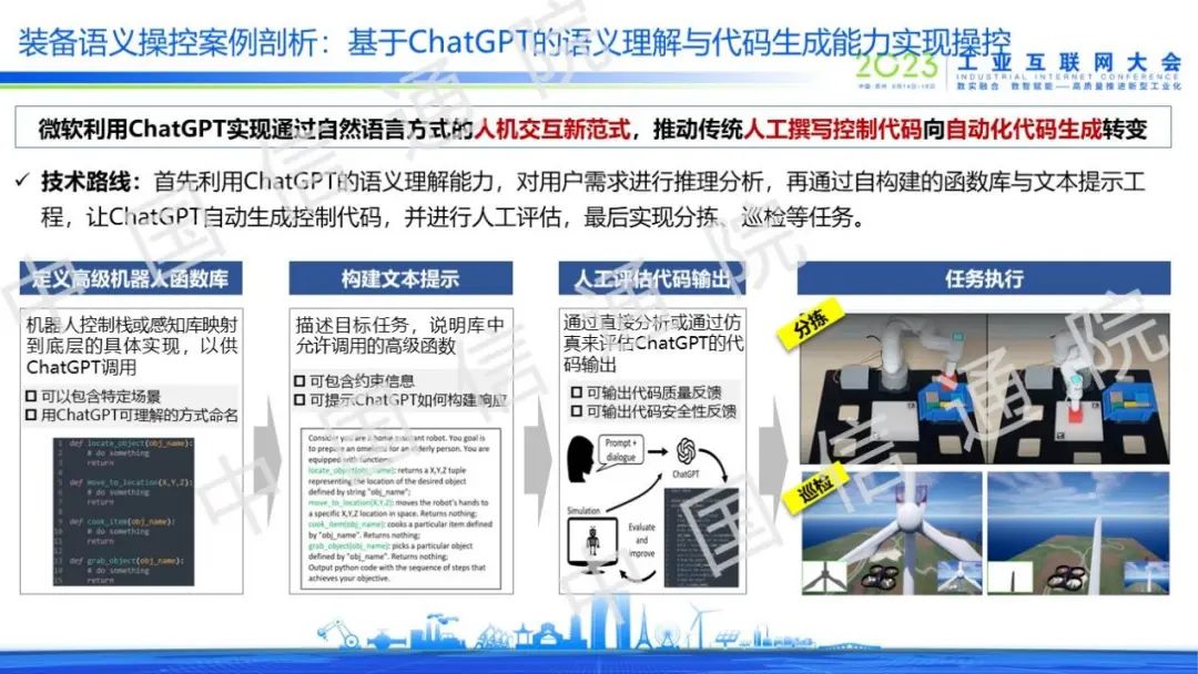 在裝備語義操控場景中,能夠利用ChatGPT的語義理解能力進行機器人智能操控,其實現邏輯是定義高級機器人函數庫,再構建文本提示,然后通過人工評估代碼輸出質量,滿足質量要求后機器人即可執行分揀和巡檢等任務,這意味著人機交互范式正在加速創新。