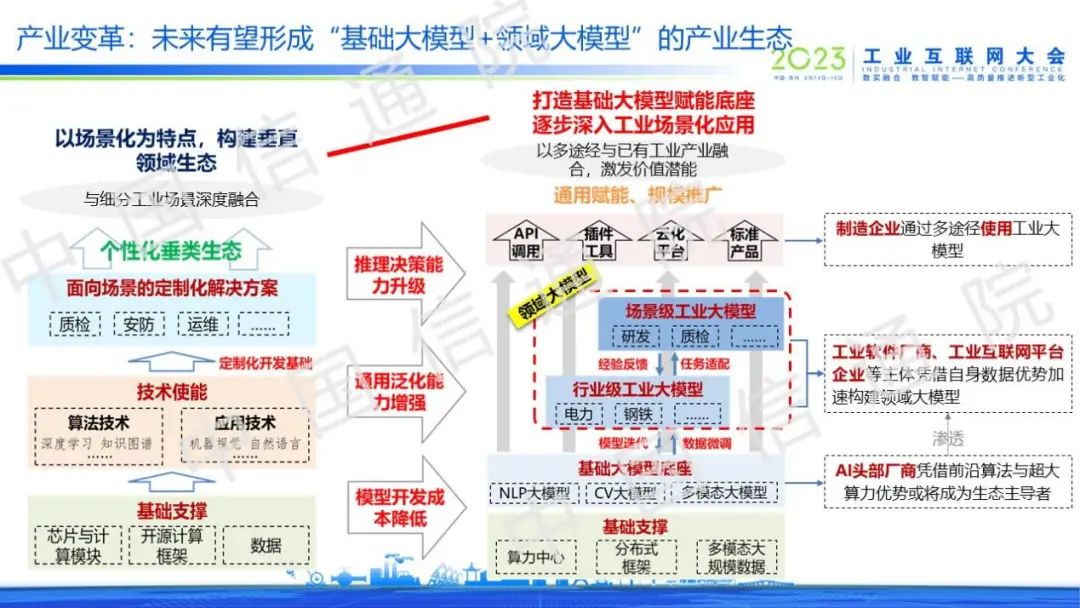 隨著大模型技術的融入,工業大模型或將打造以基礎大模型為賦能底座,逐步深入工業場景化應用的產業格局。其中,領域大模型是核心,工業軟件廠商、平臺企業等憑借自身數據優勢正加速構建工業大模型。