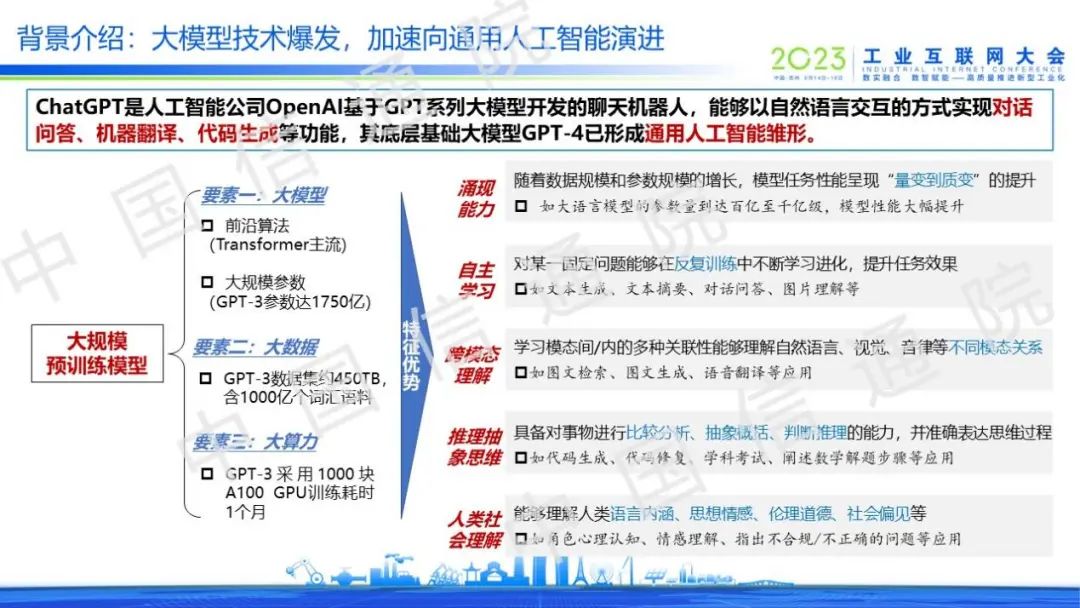 當前,以ChatGPT為代表的大規模預訓練模型已經展現出涌現能力、自主學習、跨模態理解、推理抽象思維和人類社會理解等特征優勢,已形成通用人工智能雛形,讓我們對傳統人工智能產生顛覆性認知。