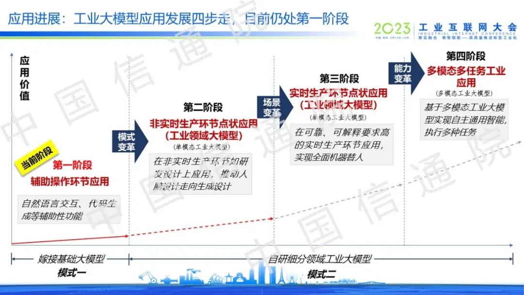 6月15日,2023工業互聯網大會在蘇州舉行,在“工業互聯網平臺創新發展”論壇上,中國信通院兩化所工互創新部王海萍指出,從應用視角來看,工業大模型發展分為四個階段,當前正處于以直接嫁接基礎大模型為主要模式的第一階段,并不斷向工業核心環節演進,逐步提升工業大模型多任務執行能力;從產業視角來看,未來工業大模型有望形成“基礎大模型+領域大模型”的產業格局,其中領域大模型的企業主體類型將更加多樣、市場競爭將愈加激烈。