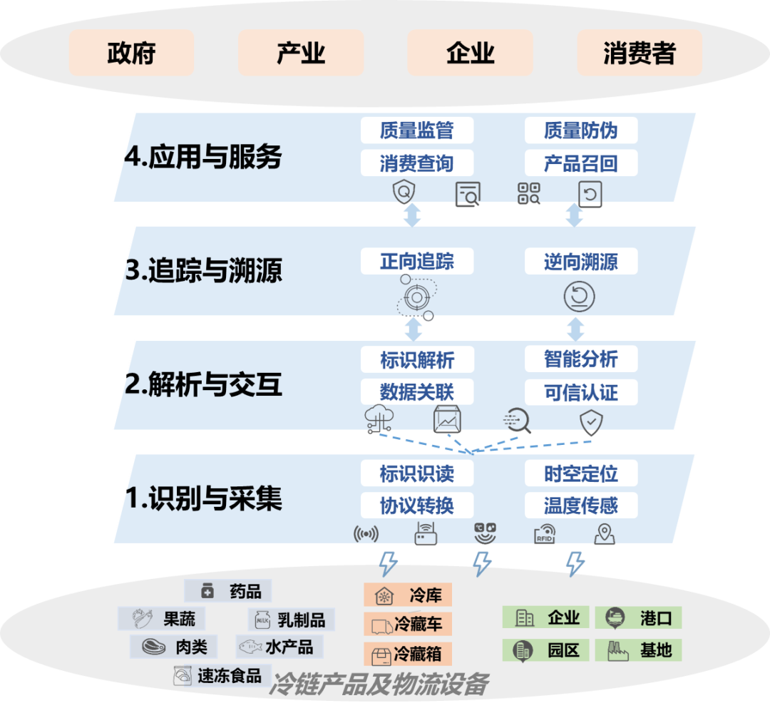 依托工業(yè)互聯(lián)網(wǎng)標(biāo)識解析基礎(chǔ)設(shè)施,以標(biāo)識解析、數(shù)據(jù)模型、主動(dòng)標(biāo)識載體、實(shí)時(shí)定位、區(qū)塊鏈等五大關(guān)鍵技術(shù)為支撐,提出了包含識別與采集、解析與交互、追蹤與溯源、應(yīng)用與服務(wù)等在內(nèi)的四層追溯架構(gòu)。通過對冷鏈物流產(chǎn)品、設(shè)備及設(shè)施等對象進(jìn)行唯一標(biāo)識,利用主動(dòng)標(biāo)識載體、時(shí)空定位等具備實(shí)時(shí)通信能力的采集設(shè)備進(jìn)行關(guān)鍵環(huán)節(jié)溫控?cái)?shù)據(jù)的可信獲取,借助標(biāo)識解析的關(guān)聯(lián)交互能力實(shí)現(xiàn)標(biāo)識對象的正向可追蹤和逆向可溯源,從而達(dá)到冷鏈物流全鏈條追溯的目標(biāo)。