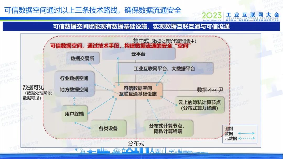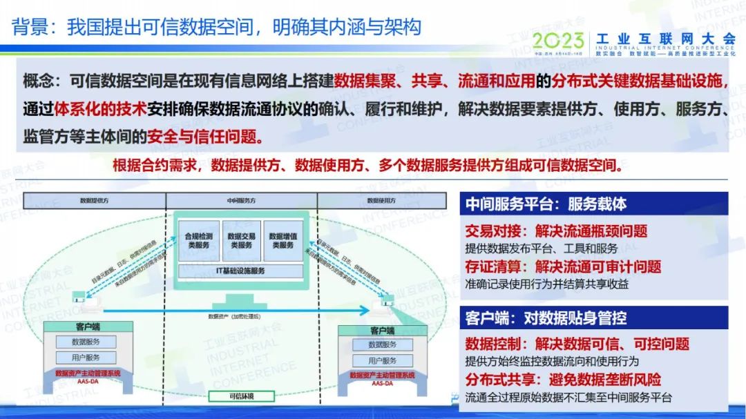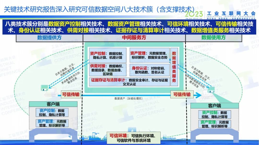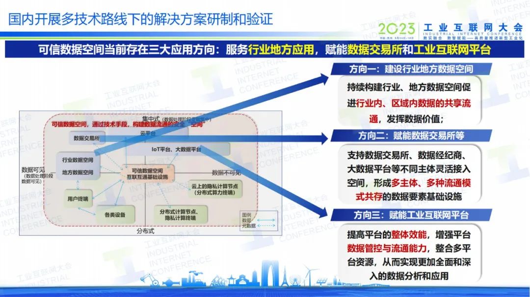 “可信數據空間是在現有的信息網絡上,通過搭建分布式的基礎設施進行體系的安排,保證數據提供方、數據使用方簽訂的數據協議的確認、履行和維護,從而解決數據提供方、使用方以及中間的算力算法,包括安全多方計算等這樣的一種數據服務的服務方以及政府監管方,各主體之間的安全與信任問題。”《可信數據流通關鍵技術研究報告》主要是研究如何通過技術手段去構建可信數據空間,以及如何保證數據基礎制度運行的閉環等問題。《可信工業數據流通應用案例集》歸納了可信數據空間的三大應用的方向的,第一類是構建行業和地方的應用,服務于行業和地方的應用,去構建行業和地方的局部數據空間;第二類是賦能現有的數據交易所,提供他們在數據交易之后對數據的保護能力;第三類是服務當前的工業互聯網平臺,通過提高用數據的安全可信能力,使得各類用戶愿意把自己的數據放到工業互聯網平臺上面。