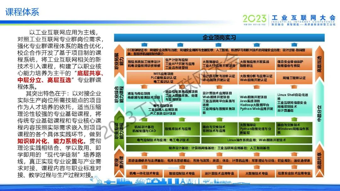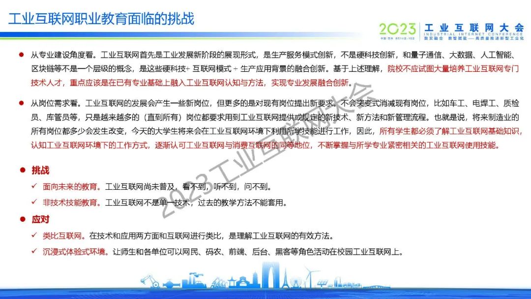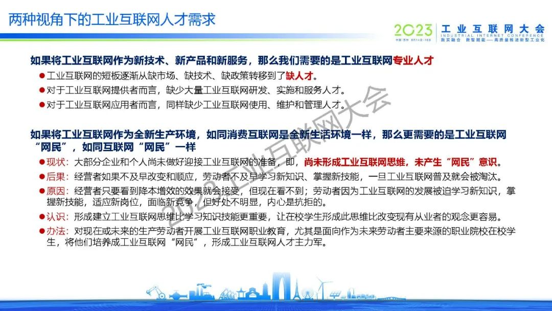 魏磊表示工業互聯網首先是工業發展新階段的展現形式,是生產服務模式創新,不是硬科技創新,和量子通信、大數據、人工智能、區塊鏈等不是一個層級的概念,是這些硬科技+ 互聯網模式 + 生產應用背景的融合創新。基于上述理解,院校不應試圖大量培養工業互聯網專門技術人才,重點應該是在已有專業基礎上融入工業互聯網認知與方法,實現專業發展融合創新。同時,所有學生都必須了解工業互聯網基礎知識,認知工業互聯網環境下的工作方式,逐漸認可工業互聯網與消費互聯網的同等地位,不斷掌握與所學專業緊密相關的工業互聯網使用技能。