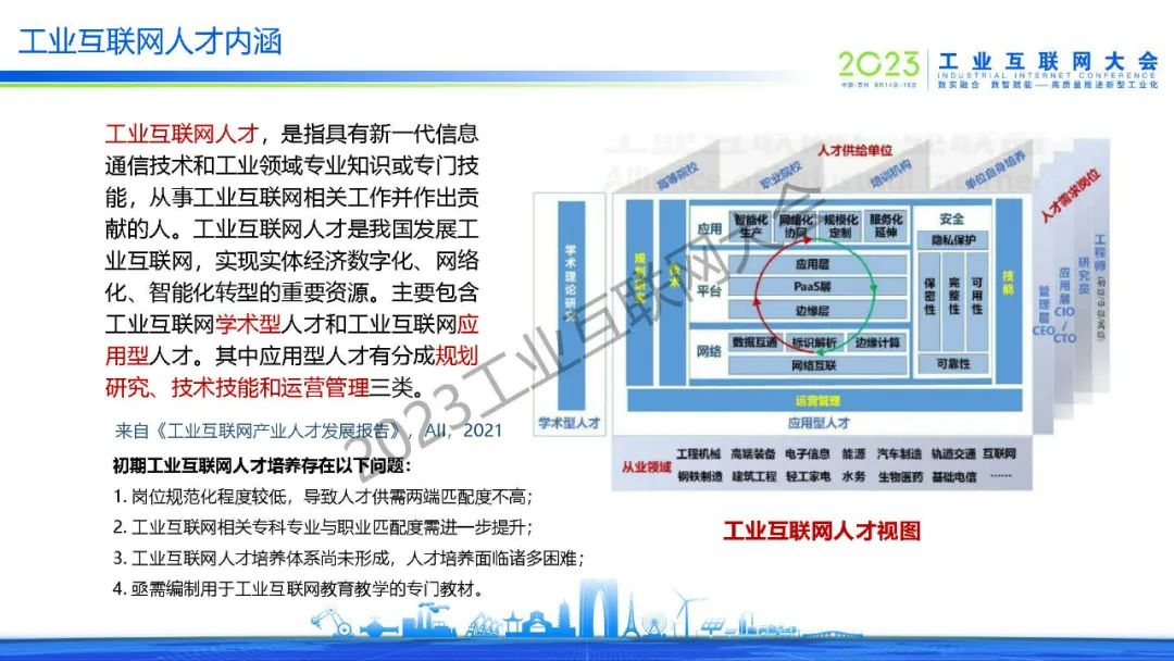 工業互聯網人才是我國發展工業互聯網,實現實體經濟數字化、網絡化、智能化轉型的重要資源。主要包含工業互聯網學術型人才和工業互聯網應用型人才。其中應用型人才有分成規劃研究、技術技能和運營管理三類。