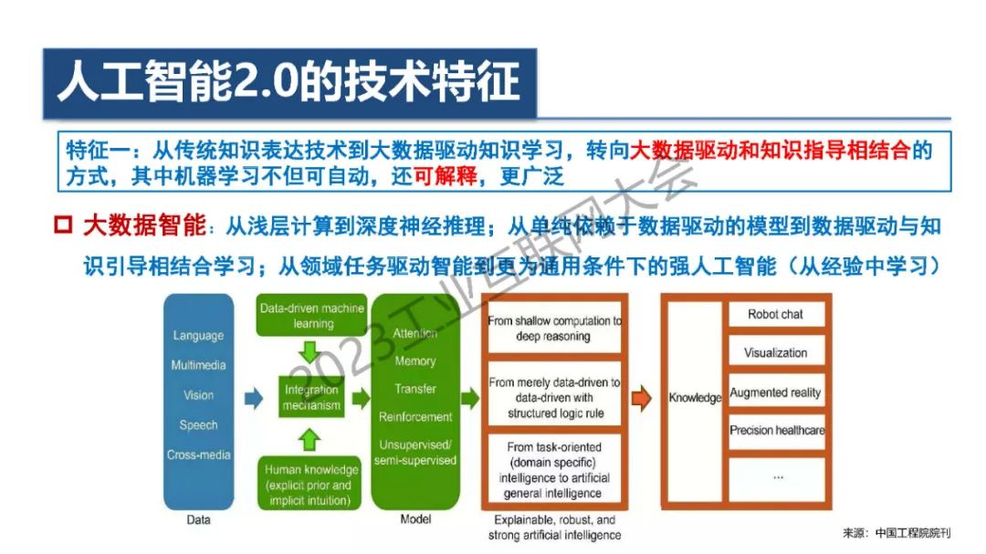 人工智能2.0的技術(shù)特征之一是從傳統(tǒng)知識表達(dá)技術(shù)到大數(shù)據(jù)驅(qū)動(dòng)知識學(xué)習(xí),轉(zhuǎn)向大數(shù)據(jù)驅(qū)動(dòng)和知識指導(dǎo)相結(jié)合的方式,其中機(jī)器學(xué)習(xí)不但可自動(dòng),還可解釋,更廣泛。