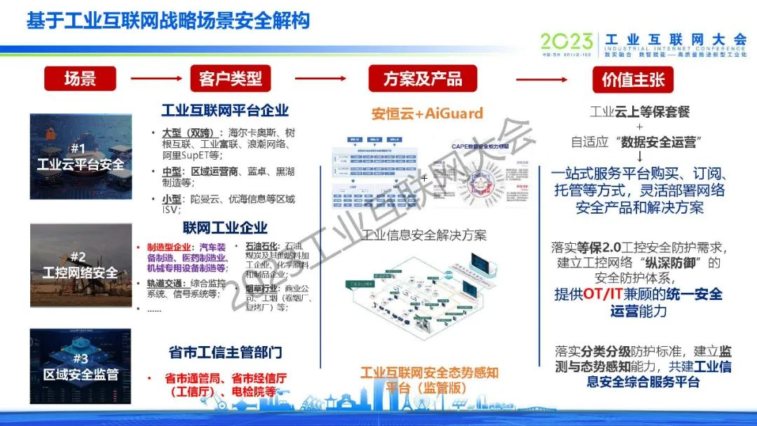 同時,安恒信息將聯網工業企業、工業互聯網平臺企業、工業信息安全管理部門作為建設工業互聯網安全保障體系的三個被服務主體,結合強大的研發技術和多年的實踐經驗,分別提供貫穿IT/OT的完整工業信息安全解決方案、工業云平臺及云應用安全解決方案和工業領域數據安全解決方案。通過搭建合規安全能力中心、綜合安全服務中心、安全運營管理中心,形成工業互聯網全棧安全防護能力,重新定義數字化轉型下的工業互聯網安全防護體系和服務模式。