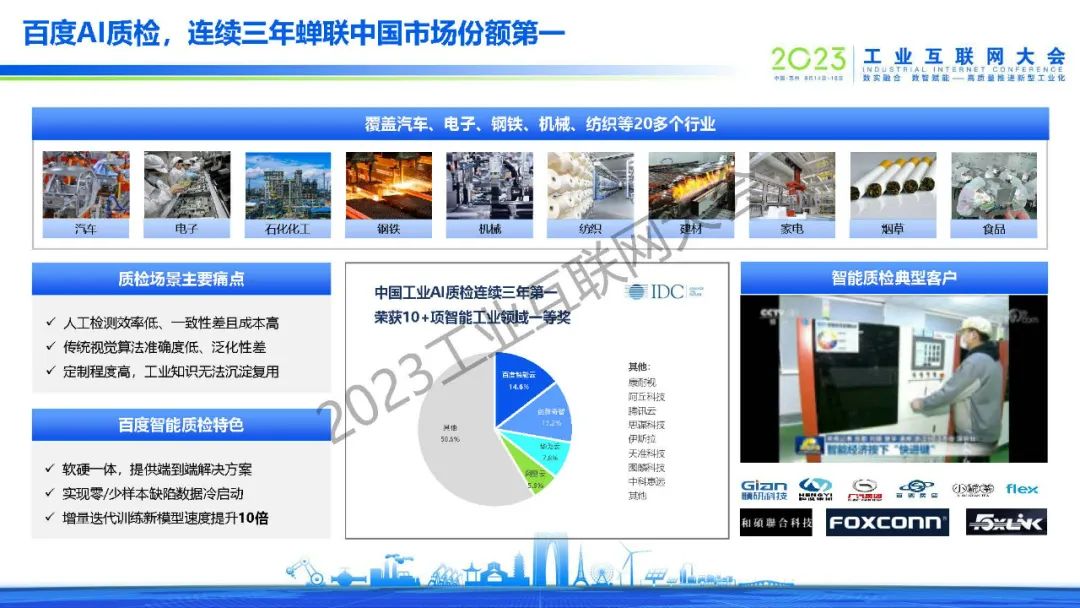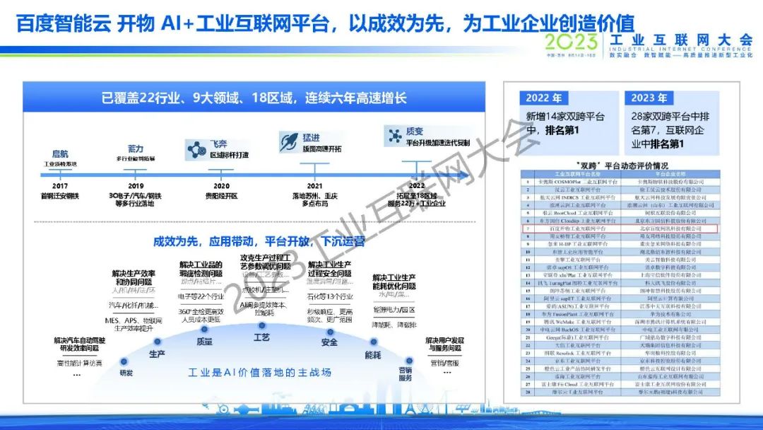 黃鋒表示,百度從2017年單一的AI質檢場景開始,逐漸拓展到安全生產、能耗優化、智能調度等場景,在生產、銷售、客戶服務、供應鏈等環節都做了大量成功案例,同時從行業拓展到區域,和地方政府共建了多個工業互聯網產業基地,批量賦能當地產業和客戶企業。2017年到今天,百度開物工業互聯網實現了規模化增長,同時也得到了工信部的認可,在2022年評為新增14家雙跨平臺第一名,2023年在所有互聯網企業中排名第一。未來也將繼續探索大模型技術在工業場景應用,將自身沉淀出的工業AI技術沉淀為平臺,和行業合作伙伴一同賦能客戶、產生價值,為工業互聯網的發展盡自己的一份力量。