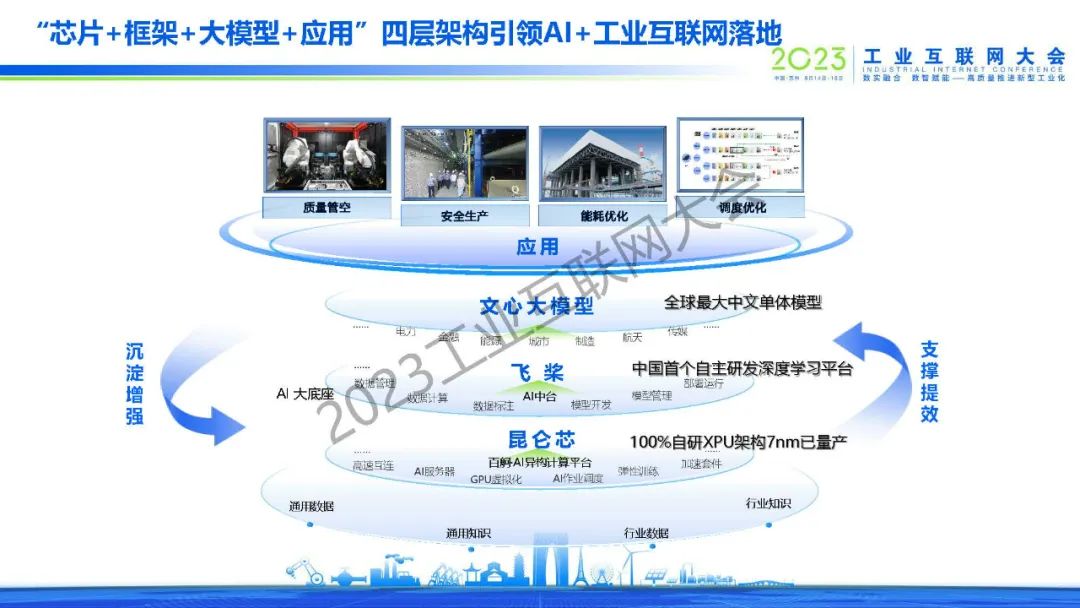 “從數據中挖掘出工業知識,并在應用中真正產生降本增效的價值,才是工業互聯網未來發展的趨勢,從數據中挖掘知識就是AI擅長的事。百度從2017年開始探索AI與工業互聯網的融合,秉承著“成效為先,應用帶動,平臺開放,下沉運營”的發展理念,通過自主研發的“芯片+框架+大模型+應用”四層架構,引領AI+工業互聯網在各個場景的落地。“