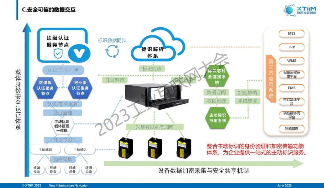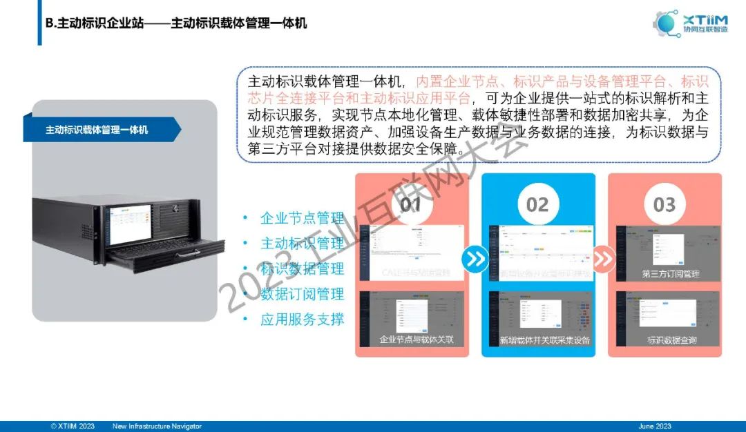 “主動標識載體管理一體機,內置企業節點、標識產品與設備管理平臺、標識芯片全連接平臺和主動標識應用平臺,可為企業提供一站式的標識解析和主動標識服務,實現節點本地化管理、載體敏捷性部署和數據加密共享,為企業規范管理數據資產、加強設備生產數據與業務數據的連接,為標識數據與第三方平臺對接提供數據安全保障。”
