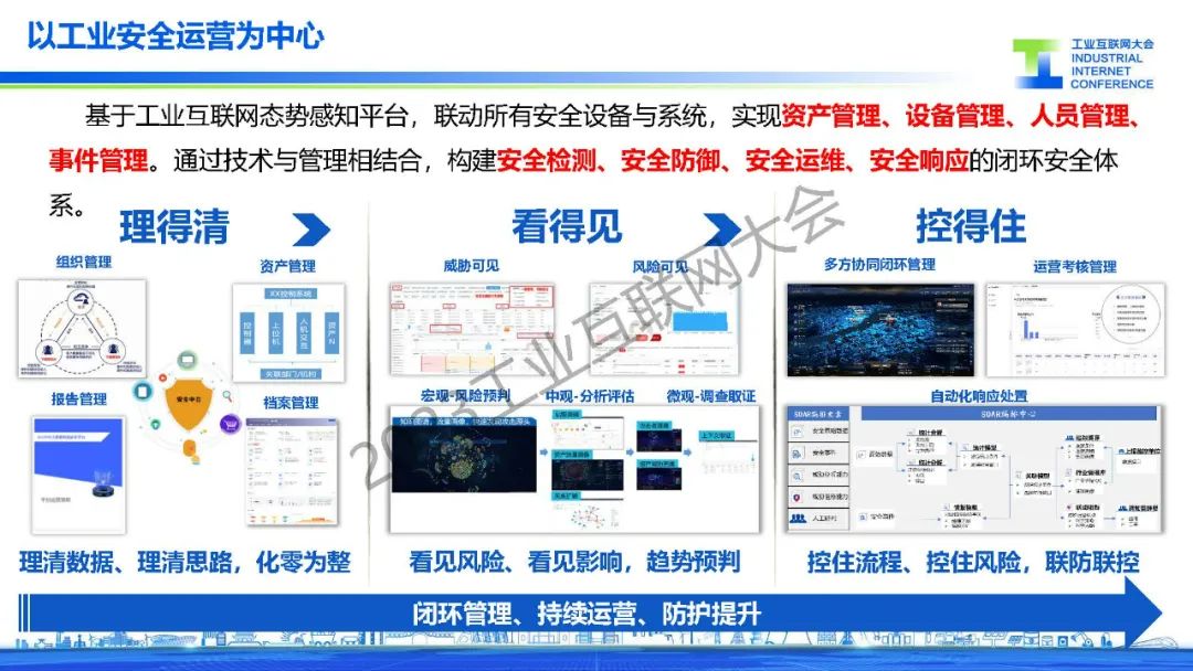 “基于工業(yè)互聯(lián)網(wǎng)態(tài)勢(shì)感知平臺(tái),聯(lián)動(dòng)所有安全設(shè)備與系統(tǒng),實(shí)現(xiàn)資產(chǎn)管理、設(shè)備管理、人員管理、事件管理。通過(guò)技術(shù)與管理相結(jié)合,構(gòu)建安全檢測(cè)、安全防御、安全運(yùn)維、安全響應(yīng)的閉環(huán)安全體系。”