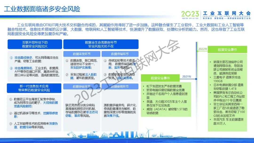 王亭景介紹,工業(yè)互聯(lián)網(wǎng)是由OT和IT兩大技術(shù)交織融合而成的,其賦能作用得到了進(jìn)一步加強(qiáng)。這種融合催生了工業(yè)軟件、工業(yè)大數(shù)據(jù)和工業(yè)人工智能等融合性技術(shù)。信息技術(shù)領(lǐng)域的云計算、大數(shù)據(jù)、物聯(lián)網(wǎng)和人工智能等技術(shù),快速提升了數(shù)據(jù)獲取、處理和分析的能力。然而,這也導(dǎo)致了工業(yè)互聯(lián)網(wǎng)數(shù)據(jù)安全風(fēng)險變得更加復(fù)雜和嚴(yán)峻。