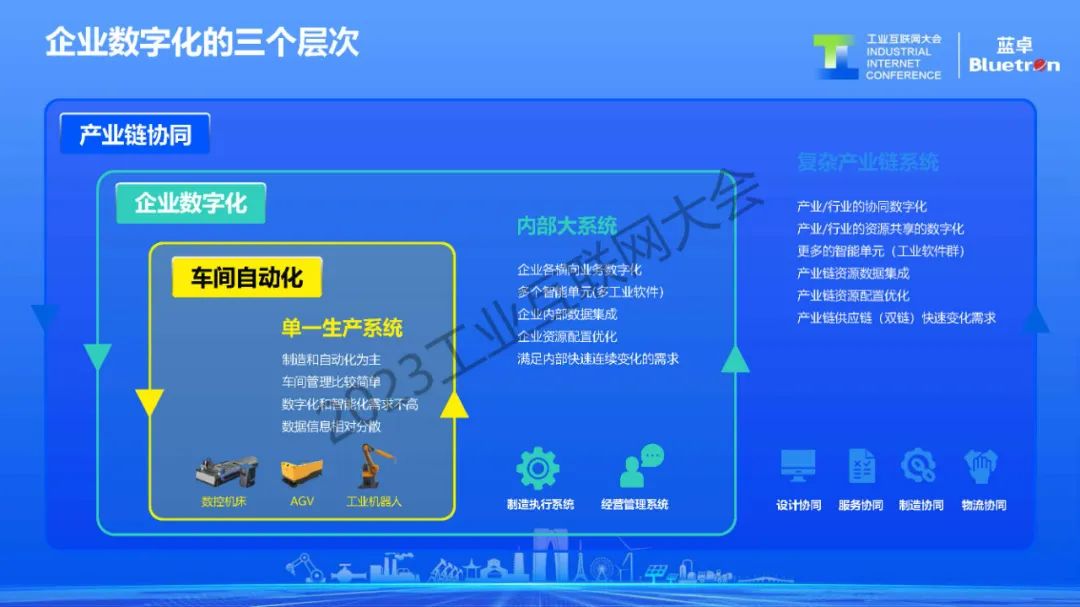 第一個層次是車間級的自動化,是企業單一的生產系統,主要解決工廠產線設備聯網以及自動化制造的問題。第二個層次是企業級的數字化,主要面向企業內部綜合的資源調度,通過互通互聯工廠生產、銷售、倉儲、物流等業務系統,以實現企業資源的最優配置。第三個層次涉及到產業鏈和供應鏈的協同,需要從產業和行業的角度做協同和資源共享。幫助企業快速響應上下游市場需求變化,以實現柔性制造。