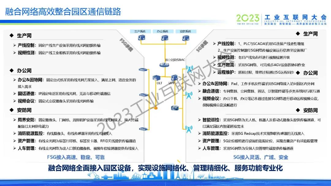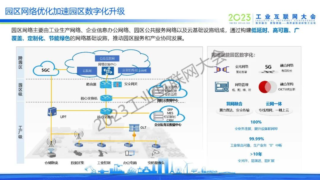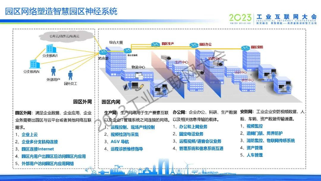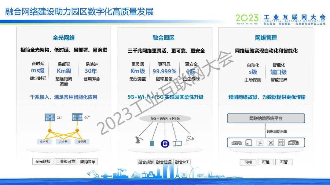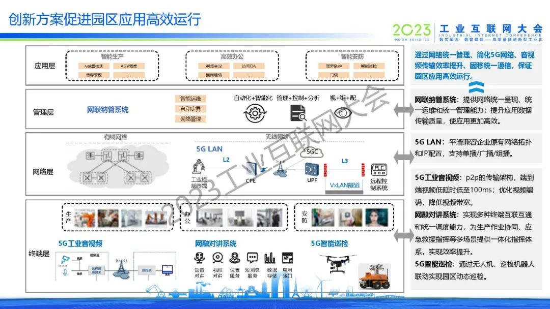 王常玲介紹,園區網絡主要由工業生產網絡、企業信息辦公網絡、園區公共服務網絡以及云基礎設施組成,通過構建低延時、高可靠、廣覆蓋、定制化、節能綠色的網絡基礎設施,推動園區服務和產業協同發展。融合網絡全面接入園區設備,實現設施網絡化、管理精細化、服務功能專業化。