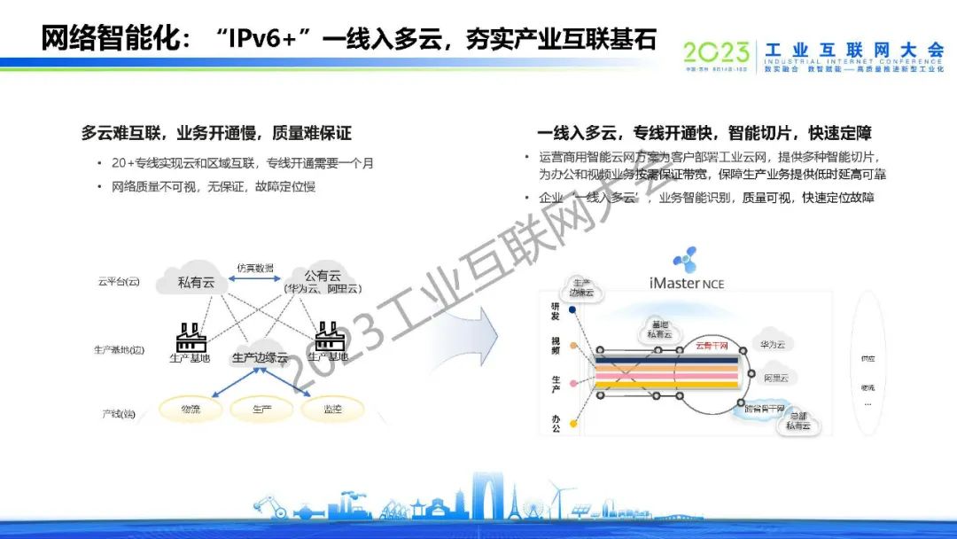 “運營商用智能云網方案為客戶部署工業云網,提供多種智能切片,為辦公和視頻業務按需保證帶寬,保障生產業務提供低時延高可靠。“