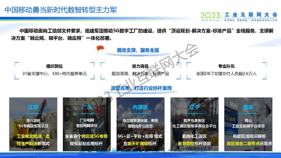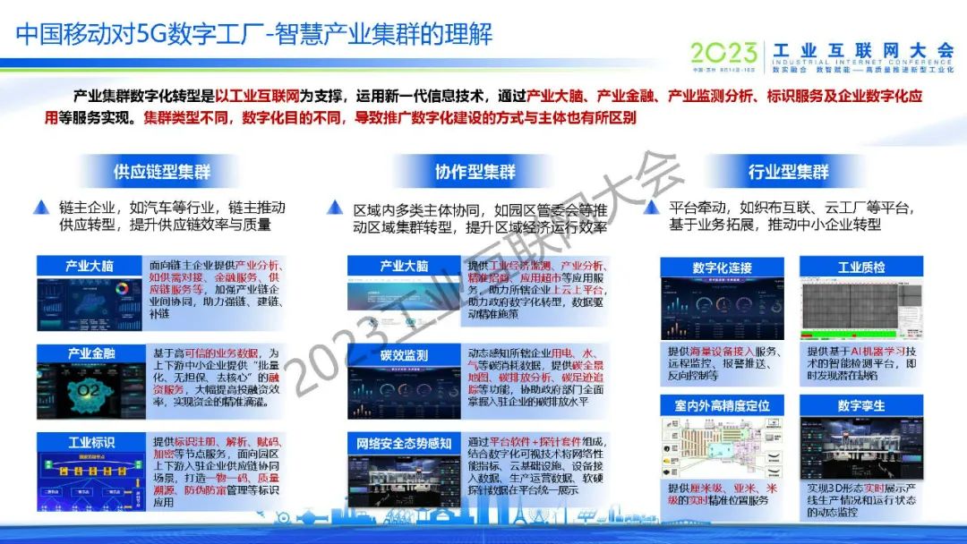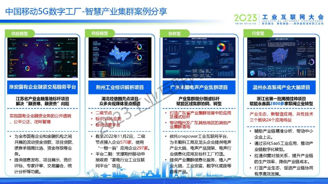 陳豫蓉表示,中國移動組建軍團推動5G數(shù)字工廠的建設(shè),提供“頂設(shè)規(guī)劃-解決方案-標(biāo)準(zhǔn)產(chǎn)品”全棧服務(wù),支撐解決方案“融云網(wǎng)、融平臺、融應(yīng)用”一體化部署。她介紹到,產(chǎn)業(yè)集群數(shù)字化轉(zhuǎn)型是以工業(yè)互聯(lián)網(wǎng)為支撐,運用新一代信息技術(shù),通過產(chǎn)業(yè)大腦、產(chǎn)業(yè)金融、產(chǎn)業(yè)監(jiān)測分析、標(biāo)識服務(wù)及企業(yè)數(shù)字化應(yīng)用等服務(wù)實現(xiàn)。集群類型不同,數(shù)字化目的不同,導(dǎo)致推廣數(shù)字化建設(shè)的方式與主體也有所區(qū)別。