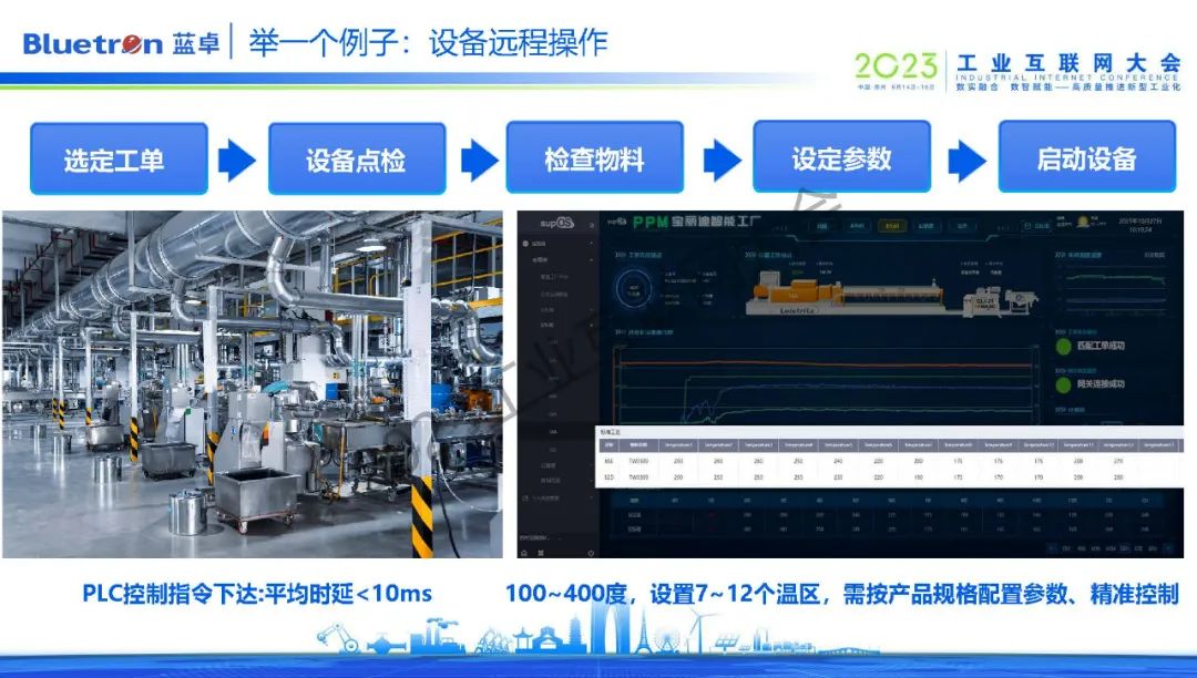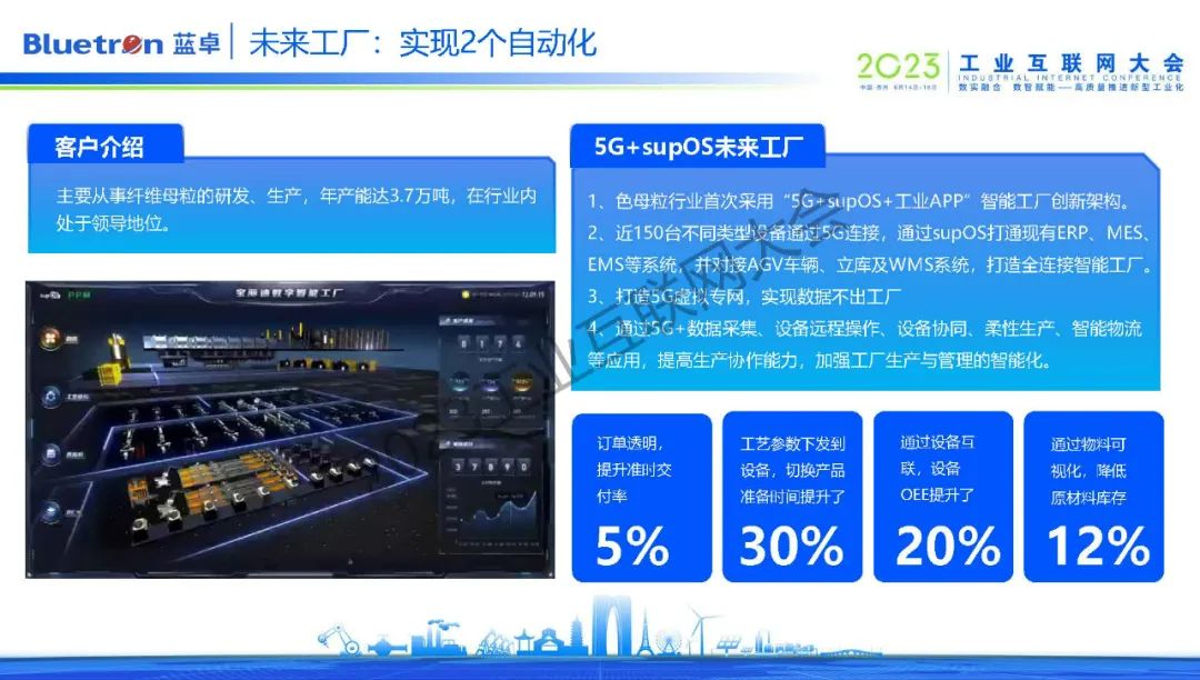 在蘇州本地,藍卓打造了纖維母粒行業(yè)首個5G+工業(yè)操作系統(tǒng)+工業(yè)APP的智能工廠。通過supOS對該企業(yè)近150臺不同類型設備進行5G連接,打通現(xiàn)有ERP、MES、EMS等系統(tǒng),對接AGV車輛、立庫及WMS系統(tǒng),從而打造了5G全連接智能工廠。通過設備遠程操作、設備協(xié)同、柔性生產、智能物流等應用,不僅提高了企業(yè)的生產協(xié)作能力,也加強工廠生產與管理的智能化。換句話說,實現(xiàn)了工業(yè)現(xiàn)場的生產制造的自動化,也實現(xiàn)了經營管理的自動化。