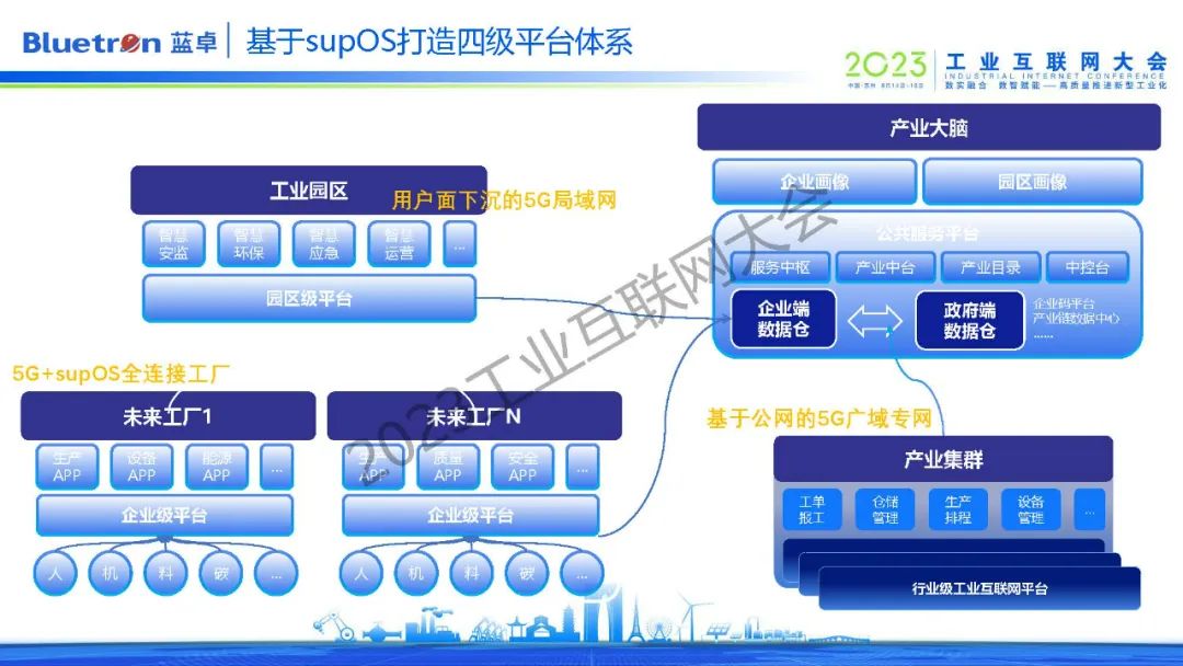 第二個是工業(yè)操作系統(tǒng),它是整個工廠的數(shù)字化轉型底座,可以連接工廠海量設備,打通工廠所有系統(tǒng),將數(shù)據集成同一個底座上,同時這個底座上有大量的預制件、組件、算法等。目前,藍卓supOS工業(yè)操作系統(tǒng)正通過平臺+APP的模式顛覆傳統(tǒng)工廠的五層架構,逐漸形成了企業(yè)、園區(qū)、行業(yè)、產業(yè)四級平臺體系。
