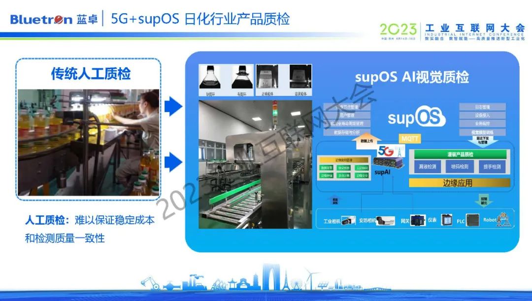在一家位于安徽日化企業(yè),為確保符合安全包裝法,產品生產后,每條產線需要2-3個人配合以肉眼對產品外觀進行檢測。而supOS依托5G技術,打造了AI質檢解決方案,通過工業(yè)攝像機采集視頻并實時上傳后臺,以AI算法檢測判斷。有效解決了傳統(tǒng)人工質檢工作量大、漏檢、錯檢的問題。