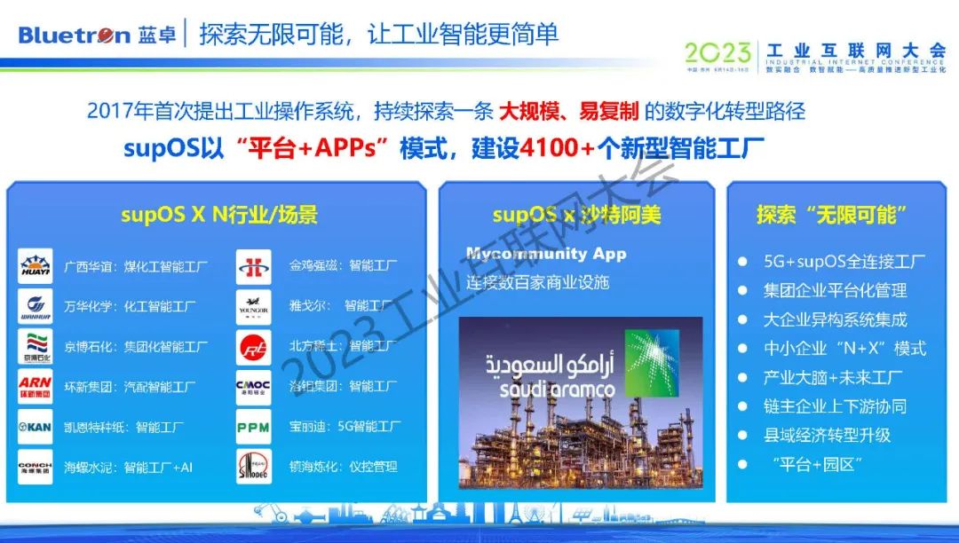 目前,藍卓正以“平臺+APP”的模式在全球范圍內打造了4100個新型智能工廠,基于工業(yè)操作系統(tǒng)的特性,藍卓也在不斷探索supOS與5G的創(chuàng)新融合,未來也希望與更多的伙伴通力合作,共同高質量推進我國新型工業(yè)化的建設。