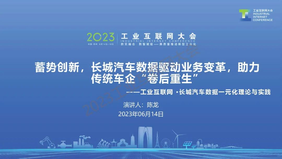 6月14日,在2023工業(yè)互聯(lián)網(wǎng)大會(huì)“工業(yè)互聯(lián)網(wǎng)助力企業(yè)數(shù)字化轉(zhuǎn)型高端論壇”上,長(zhǎng)城汽車股份有限公司產(chǎn)業(yè)數(shù)智化中心副總經(jīng)理陳龍發(fā)表了《工業(yè)互聯(lián)網(wǎng)·長(zhǎng)城汽車數(shù)據(jù)一元化理論與實(shí)踐》的主題演講。