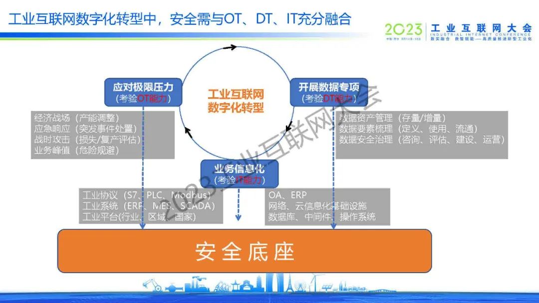 喬思遠(yuǎn)指出工業(yè)互聯(lián)網(wǎng)是建成數(shù)字中國的實(shí)體基礎(chǔ),也是典型的復(fù)雜產(chǎn)業(yè)融合體系。隨著工業(yè)互聯(lián)網(wǎng)發(fā)展帶來的新安全問題,產(chǎn)融各界需協(xié)同守住工業(yè)互聯(lián)網(wǎng)安全底線。工業(yè)互聯(lián)網(wǎng)數(shù)字化安全體系應(yīng)圍繞數(shù)據(jù)展開,需與OT、DT、IT充分融合,建立工業(yè)互聯(lián)網(wǎng)產(chǎn)業(yè)生態(tài)體系。