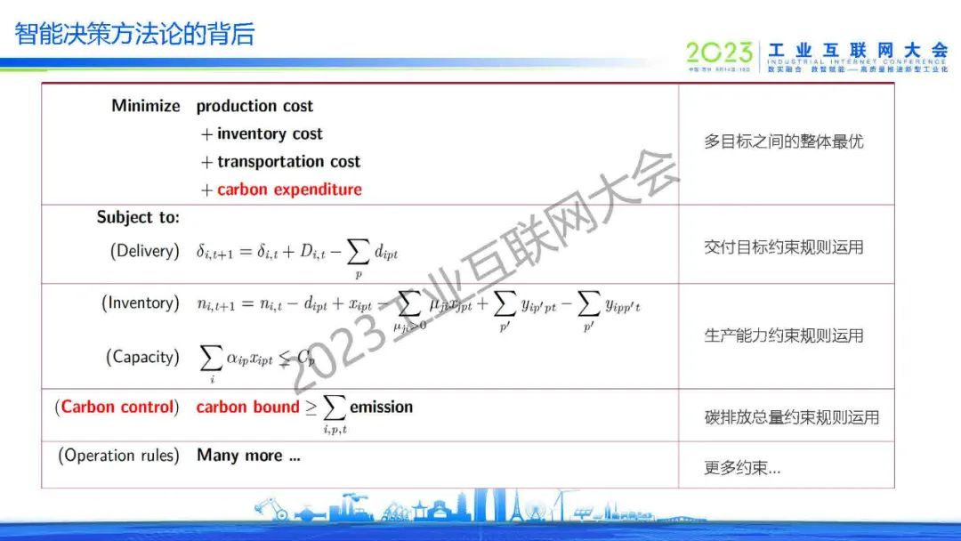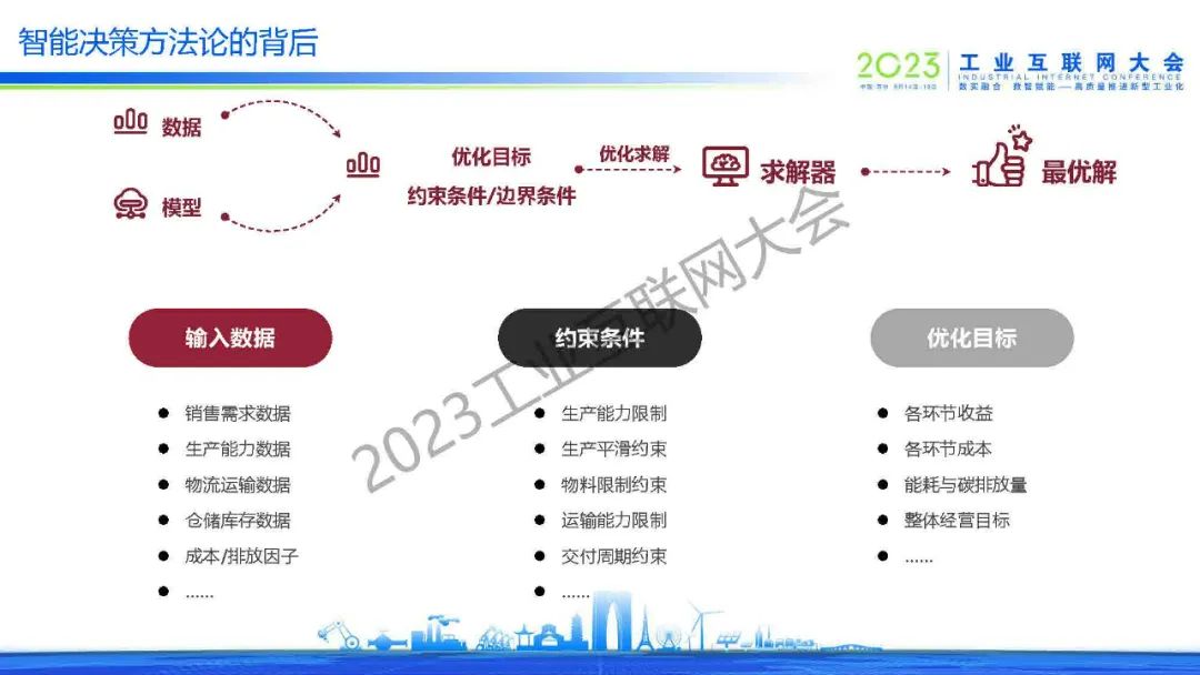 王曦分享了裝備、化工和耐用消費(fèi)品的三個(gè)需求樣例,提出了在服務(wù)工業(yè)數(shù)字化轉(zhuǎn)型升級(jí)中觀察到的四大需求:數(shù)據(jù)驅(qū)動(dòng)、決策導(dǎo)向、尋找最優(yōu)和快速前瞻。智能決策方法論是通過輸入數(shù)據(jù)和模型,在優(yōu)化目標(biāo)和約束條件(邊界條件)下優(yōu)化求解出最優(yōu)解。