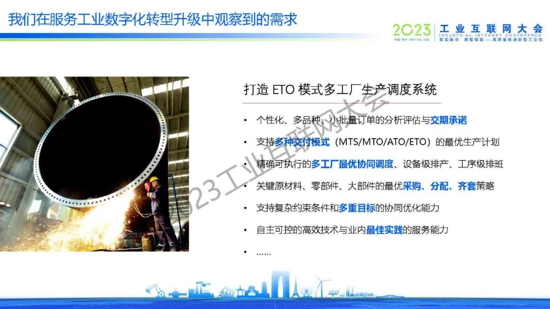 “裝備制造企業(yè)的數(shù)字化轉(zhuǎn)型就是打造 ETO 模式多工廠生產(chǎn)調(diào)度系統(tǒng)。它涵蓋了很多信息的抽象性需求描述,可能包括多品種,小批量訂單的交期承諾,可能包括個(gè)性化、多品種、小批量訂單的分析評(píng)估與交期承諾、支持多種交付模式(MTS/MTO/ATO/ETO)的最優(yōu)生產(chǎn)計(jì)劃、精確可執(zhí)行的多工廠最優(yōu)協(xié)同調(diào)度、設(shè)備級(jí)排產(chǎn)、工序級(jí)排班等。“