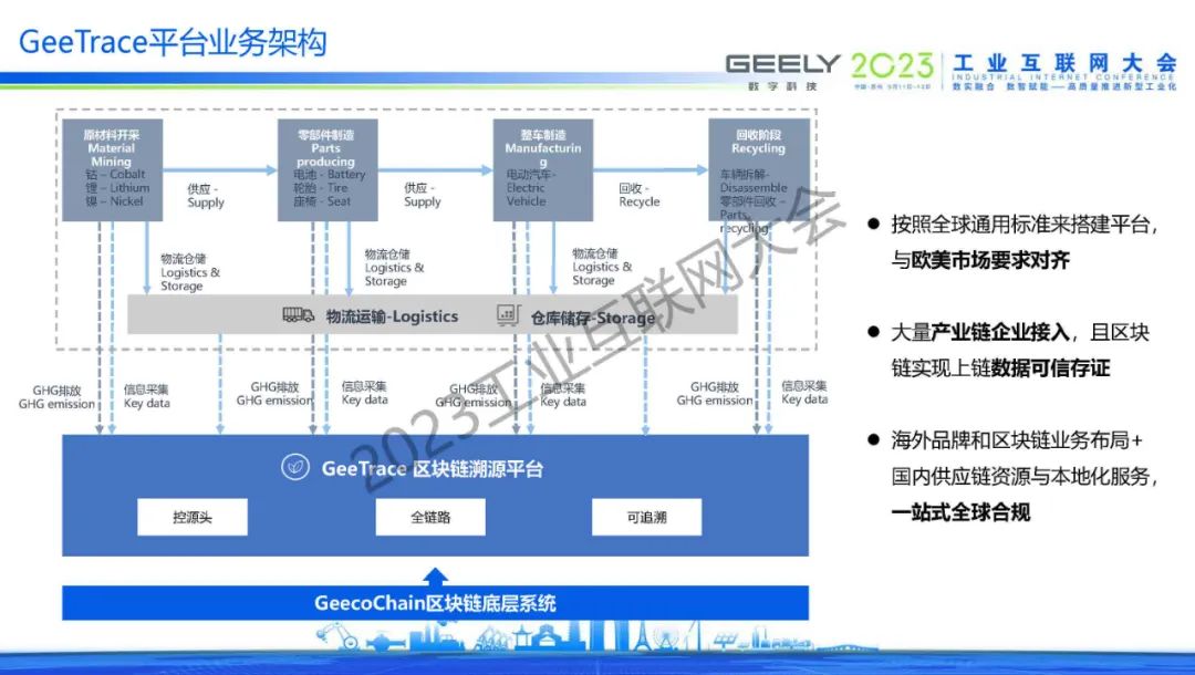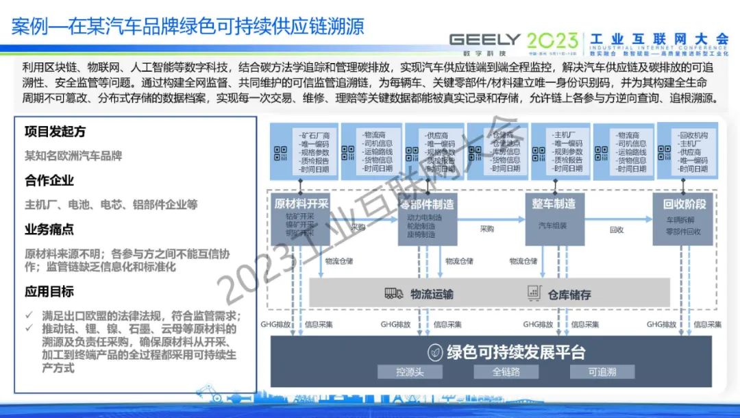 “利用區(qū)塊鏈、物聯(lián)網(wǎng)、人工智能等數(shù)字科技,結(jié)合碳方法學(xué)追蹤和管理碳排放,實現(xiàn)汽車供應(yīng)鏈端到端全程監(jiān)控,解決汽車供應(yīng)鏈及碳排放的可追溯性、安全監(jiān)管等問題。通過構(gòu)建全網(wǎng)監(jiān)督、共同維護的可信監(jiān)管追溯鏈,為每輛車、關(guān)鍵零部件/材料建立唯一身份識別碼,并為其構(gòu)建全生命周期不可篡改、分布式存儲的數(shù)據(jù)檔案,實現(xiàn)每一次交易、維修、理賠等關(guān)鍵數(shù)據(jù)都能被真實記錄和存儲,允許鏈上各參與方逆向查詢、追根溯源。”