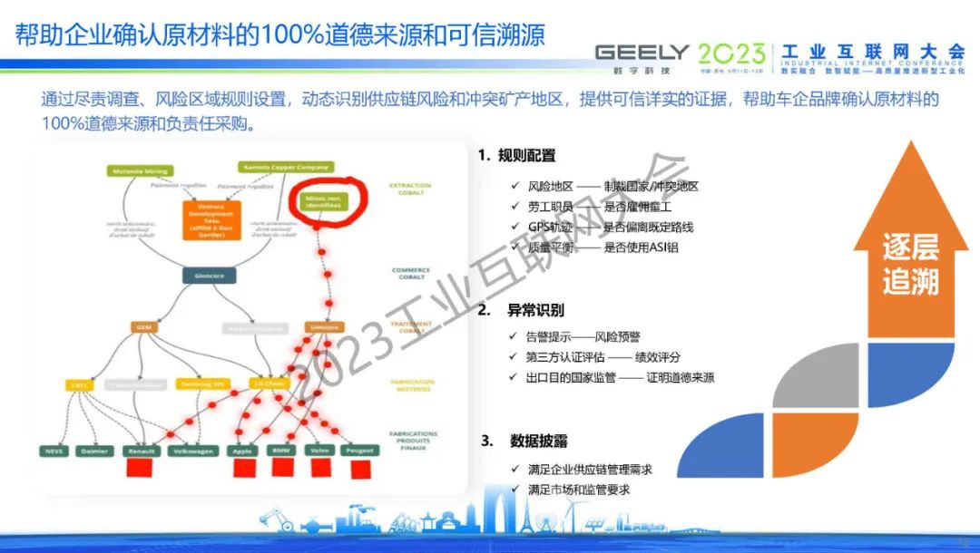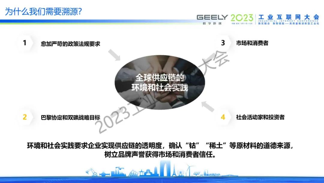 賽磊表示,環(huán)境和社會實踐要求企業(yè)實現(xiàn)供應(yīng)鏈的透明度,確認“鈷”“稀土”等原材料的道德來源,樹立品牌聲譽獲得市場和消費者信任。面對于復(fù)雜供應(yīng)鏈,數(shù)字化追溯是剛需。溯源的兩個重要組成部分,首先供應(yīng)鏈透明度和可見性,其次數(shù)據(jù)信息披露、滿足監(jiān)管合規(guī)。