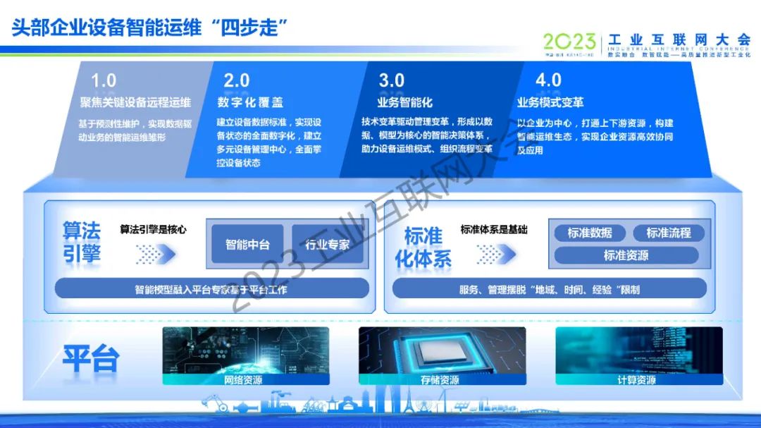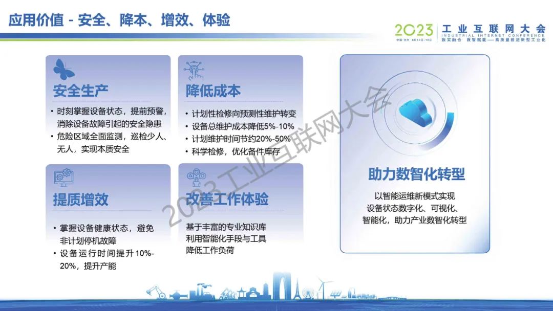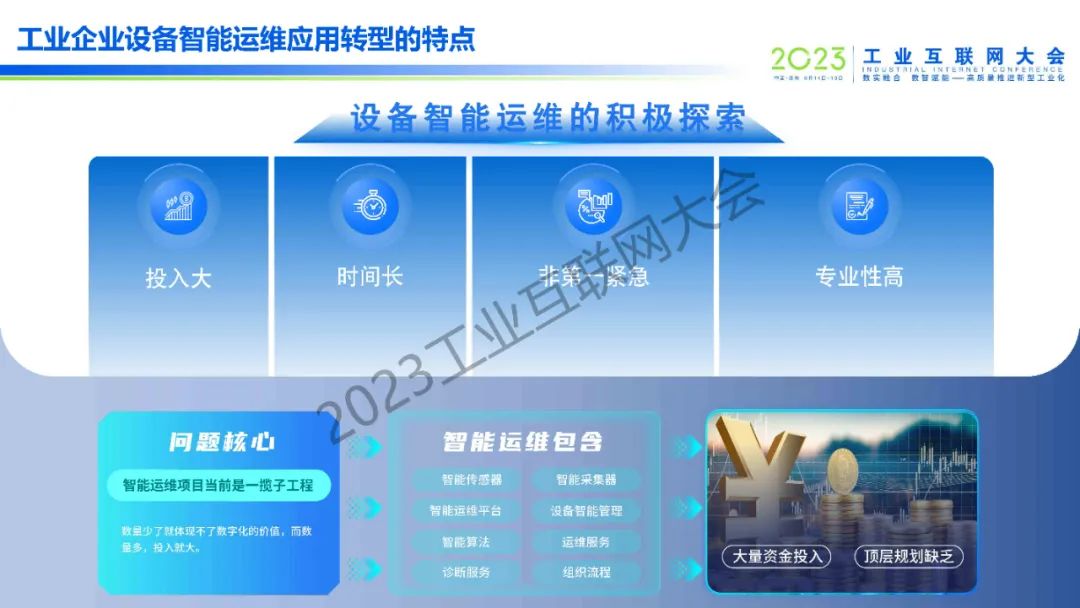李星星介紹,建設(shè)智能工廠,智能生產(chǎn)、智能運(yùn)維和智慧經(jīng)營(yíng)是三大板塊。工業(yè)企業(yè)設(shè)備智能運(yùn)維應(yīng)用轉(zhuǎn)型的特點(diǎn)是投入大、時(shí)間長(zhǎng)、非第一緊急、專(zhuān)業(yè)性高。企業(yè)設(shè)備智能運(yùn)維可以通過(guò)聚焦關(guān)鍵設(shè)備遠(yuǎn)程運(yùn)維、數(shù)字化覆蓋、業(yè)務(wù)智能化和業(yè)務(wù)模式變革來(lái)推進(jìn),達(dá)到降本增效的目的。
