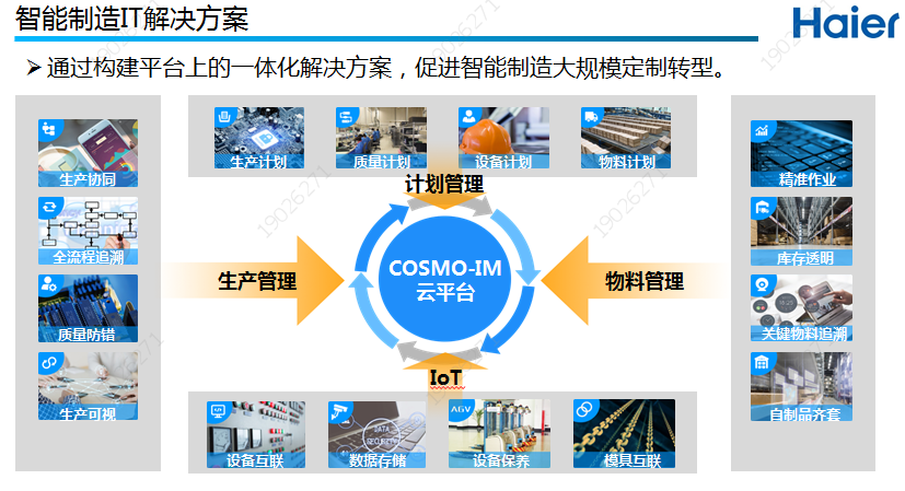 現在海爾集團COSMO-MES、WMS、COSMO-Iot (Scada/Automaition)、PLM、ERP等五大系統高效協同與集成情況為支持工廠轉型,海爾搭建了以COSMO-MES系統為核心,包括PLM協同研發系統(包含CAD/CAPP/設計仿真、制造仿真)、ERP企業資源計劃系統、WMS智慧物流、COSMO-Iot智慧設備控制系統(生產數據采集分析等)5大信息系統集成互聯的信息化體系,業務上通過智能的制造,把制造、研發、物流緊密的互聯互通,并形成了家電行業的互聯工廠的信息化標準。在縱向上實現了從企業到工廠到車間到每一臺設備每一個人的實時互聯,即機機互聯、機物互聯、人機互聯;橫向上實現了從用戶的需求再到產品設計、制造、物流、服務,整個全流程的供應鏈體系的互聯,即虛實互聯、信息互聯、內外互聯。通過搭建的互聯工廠信息化體系,用戶能夠在全球任何一個地方任何一個時間,通過他的移動終端隨時可以定制他的產品,互聯工廠也可以隨時感知隨時滿足用戶的需求。
