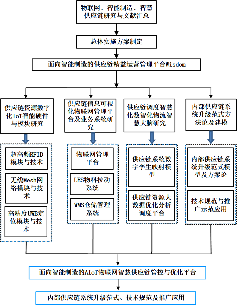 TBL華清科盛搜集物聯(lián)網(wǎng)、智能制造、智慧供應(yīng)鏈的研究文獻(xiàn)與資料,針對制約企業(yè)智能制造轉(zhuǎn)型的內(nèi)部供應(yīng)鏈系統(tǒng)數(shù)智化程度低、管理手段落后、供應(yīng)鏈運營數(shù)據(jù)采集與利用有效性低、供應(yīng)鏈供給保障缺乏前瞻性預(yù)測等技術(shù)難題進(jìn)行重點研究,通過對IoT智能硬件與裝備、物聯(lián)網(wǎng)管理平臺與業(yè)務(wù)系統(tǒng)、供應(yīng)鏈資源大數(shù)據(jù)優(yōu)化分析平臺等研究與集成創(chuàng)新,為內(nèi)部供應(yīng)鏈系統(tǒng)數(shù)智化升級提供關(guān)鍵技術(shù)、IoT硬件模塊及系統(tǒng)解決方案,建設(shè)面向智能制造的供應(yīng)鏈精益運營管理平臺Wisdom?進(jìn)行示范驗證;同時,提出并制定內(nèi)部供應(yīng)鏈系統(tǒng)數(shù)智化升級范式方法論及相關(guān)技術(shù)規(guī)范,在行業(yè)內(nèi)進(jìn)行推廣應(yīng)用。本項目的實施技術(shù)路線如下圖所示。