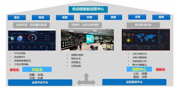 供應(yīng)鏈智能運(yùn)營(yíng)中心不是一個(gè)供應(yīng)鏈業(yè)務(wù)操作平臺(tái),它是一個(gè)供應(yīng)鏈端到端指揮和 管理平臺(tái),通過統(tǒng)一指揮,實(shí)現(xiàn)組織間高效協(xié)同,快速響應(yīng)需求,提升運(yùn)營(yíng)效率 ;它可以分三 層架構(gòu),第一層是基礎(chǔ)層,實(shí)現(xiàn)供應(yīng)鏈業(yè)務(wù)線上可視、風(fēng)險(xiǎn)預(yù)警 ;第二層是數(shù)據(jù)驅(qū)動(dòng)預(yù)測(cè) 性分析,通過基于業(yè)務(wù)場(chǎng)景構(gòu)建算法模型,對(duì)發(fā)現(xiàn)問題進(jìn)行根因分析及未來趨勢(shì)判斷 ;第 三層是自動(dòng)執(zhí)行層,它基于預(yù)測(cè)分析、場(chǎng)景模擬分析,通過機(jī)器學(xué)習(xí)自改善,給出問題或風(fēng) 險(xiǎn)改善建議,并自動(dòng)執(zhí)行形成閉環(huán)。