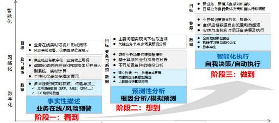 第二階段 :業(yè)務(wù)可預(yù)測(cè)。對(duì)供應(yīng)鏈各業(yè)務(wù)能實(shí)現(xiàn)未來風(fēng)險(xiǎn)預(yù)警。構(gòu)建各關(guān)鍵業(yè)務(wù)環(huán) 節(jié)的典型業(yè)務(wù)場(chǎng)景數(shù)據(jù)模型,通過現(xiàn)有及外來的大數(shù)據(jù)分析來追溯現(xiàn)有問題根因以及預(yù) 測(cè)未來趨勢(shì)和風(fēng)險(xiǎn)應(yīng)對(duì),這一階段可先實(shí)現(xiàn)內(nèi)部供應(yīng)鏈協(xié)同與應(yīng)用,并逐步擴(kuò)大到關(guān)鍵客 戶與供應(yīng)商的協(xié)同與應(yīng)用。