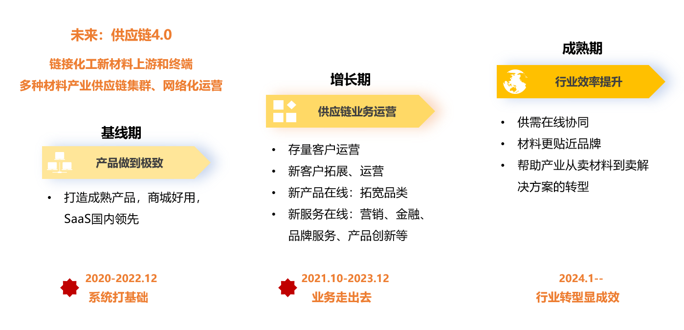 基線期的核心任務(wù)是完成SaaS平臺的打造,以華峰集團(tuán)旗下各產(chǎn)業(yè)公司的交易場景為試點(diǎn),完成聚焦在復(fù)雜工業(yè)訂單線上化、工業(yè)支付線上化、物流數(shù)據(jù)在線和開放商城平臺打造,具備產(chǎn)業(yè)內(nèi)和外部客戶推廣的基礎(chǔ)。基線期內(nèi)的主要實(shí)施方式和路徑為:首先確定試點(diǎn)產(chǎn)業(yè),平臺從2018年開始選擇華峰超纖作為首批上線試點(diǎn)產(chǎn)業(yè)公司,搭建了下單+票據(jù)支付模塊,完成訂單基礎(chǔ)功能搭建;至2020年全面升級2.0版本,該版本支持華峰新材料、華峰氨綸上線,進(jìn)一步完善了自主下單+邀約下單的模式以及完成票據(jù)、電匯、轉(zhuǎn)賬等全場景支付工具功能部署;2021年進(jìn)入從內(nèi)部平臺到商城開放,產(chǎn)業(yè)上線擴(kuò)大到8個大品類,同時拓展下游客戶作為賣家上線,對外提供SaaS服務(wù)。