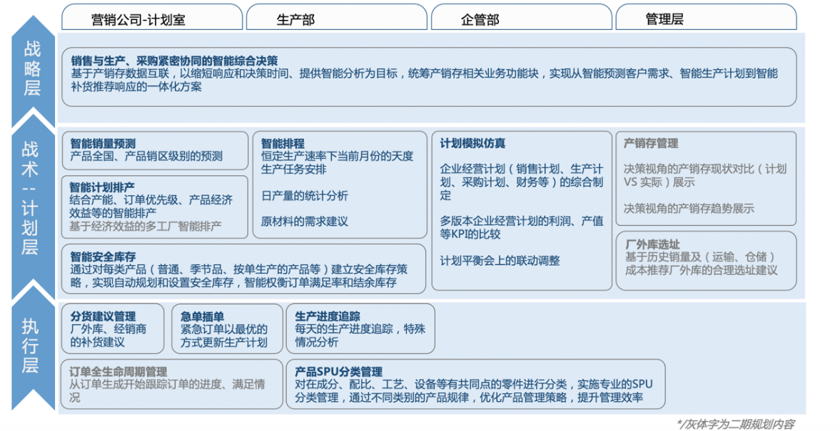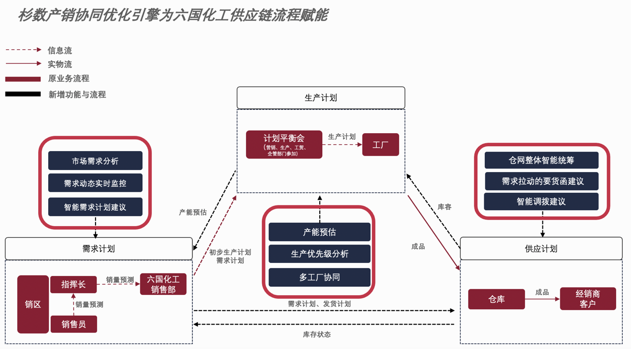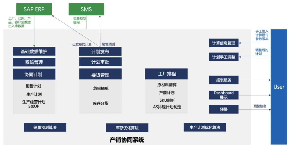 通過(guò)搭建一套產(chǎn)銷協(xié)同系統(tǒng),與六國(guó)現(xiàn)有SAP ERP及SMS對(duì)接,引入AI預(yù)測(cè)算法及運(yùn)籌優(yōu)化算法,優(yōu)化需求計(jì)劃、優(yōu)化補(bǔ)貨及庫(kù)存策略、優(yōu)化生產(chǎn)計(jì)劃、實(shí)現(xiàn)產(chǎn)銷協(xié)同模擬,以應(yīng)對(duì)產(chǎn)品需求多樣性的市場(chǎng),實(shí)現(xiàn)提升產(chǎn)銷協(xié)同能力、提高市場(chǎng)響應(yīng)速度、提高投入產(chǎn)出比、提升精細(xì)化管理能力。