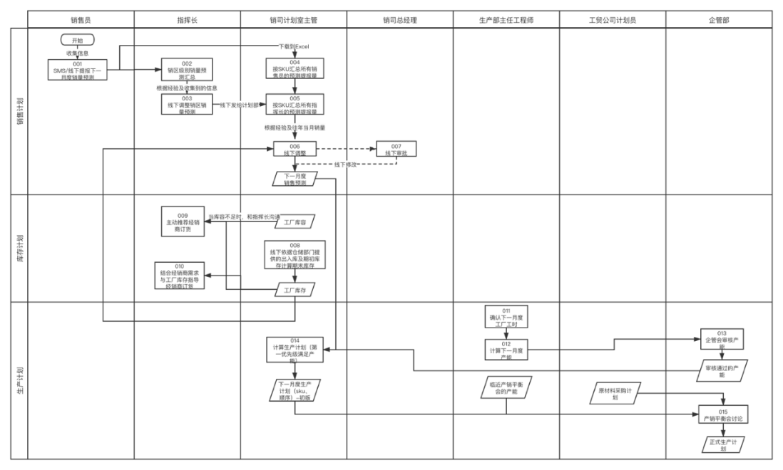 006 | 線下調(diào)整 | 銷司計(jì)劃室主管 | 依據(jù)歷年各月銷量及工廠當(dāng)前庫(kù)存調(diào)整上一過(guò)程(004)Excel中各sku的銷量 | 歷年各月銷量 工廠庫(kù)存 |