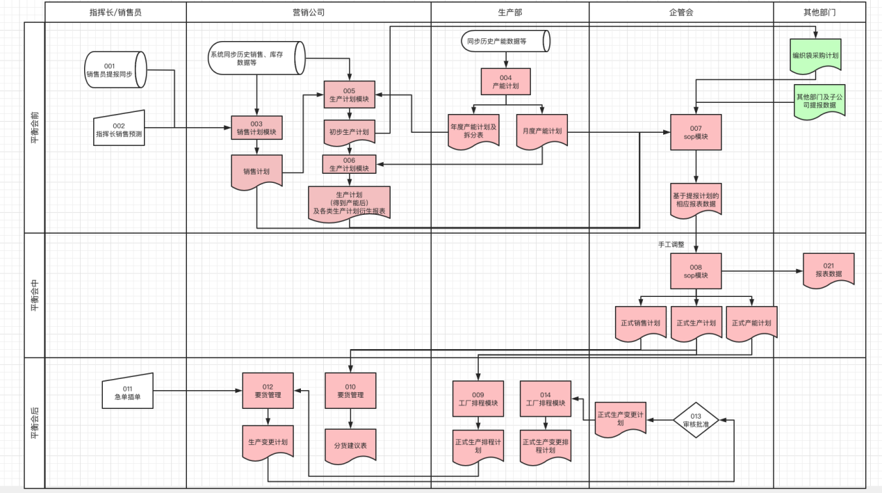 008 | 平衡會(huì) | 企管會(huì) | 根據(jù)企管會(huì)在sop模塊上進(jìn)行的指標(biāo)計(jì)算進(jìn)行討論決定正式計(jì)劃 | 月度產(chǎn)能計(jì)劃; 生產(chǎn)計(jì)劃; 銷售計(jì)劃; 采購(gòu)計(jì)劃; 其他部門提報(bào)數(shù)據(jù); 各類報(bào)表數(shù)據(jù) | 正式月度產(chǎn)能計(jì)劃; 正式生產(chǎn)計(jì)劃; 正式銷售計(jì)劃; 正式采購(gòu)計(jì)劃; 各類報(bào)表數(shù)據(jù) |