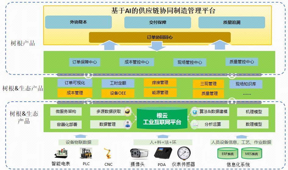 基于根云工業互聯網平臺強大的連接能力,樹根互聯基于設備物聯數據、人員設備信息,工藝、作業數據以及對人、機、料、法、環的鏈接,協同生態伙伴提供訂單可視化、工時定額、焊接管理、三現管理、成本管理、設備OEE、能源管理、質量管理等產品,實現智能云工廠與閉環供應鏈的有效連接,主要表現在以下方面:
