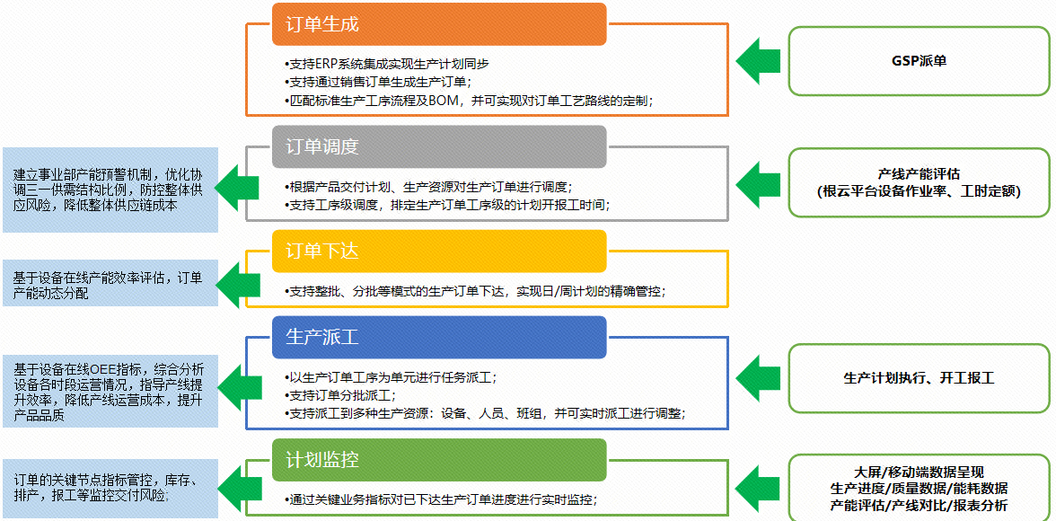 可支持ERP系統集成實現生產計劃同步;支持通過銷售訂單生成生產訂單;匹配標準生產工序流程及BOM,并可實現對訂單工藝路線的定制,最后通過GSP給供應商派單。