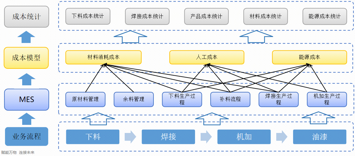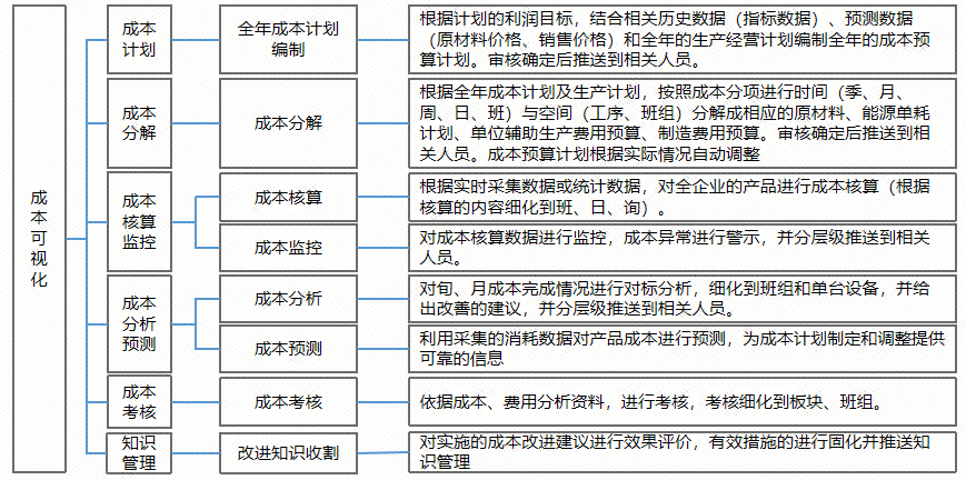 能實時跟蹤生產過程各工序的成本信息,并及時形成信息反饋,實現全廠成本的全過程管控。它能夠根據企業下達的生產任務和成本指標制定企業的成本計劃,然后按照成本分項進行時間與空間的分解,并對整個生產過程進行成本的核算、監控、分析、預測、優化、考核,進行知識收割,實現與生產、計劃、能源、設備、物流、銷售、采購、庫存和知識管理的協同