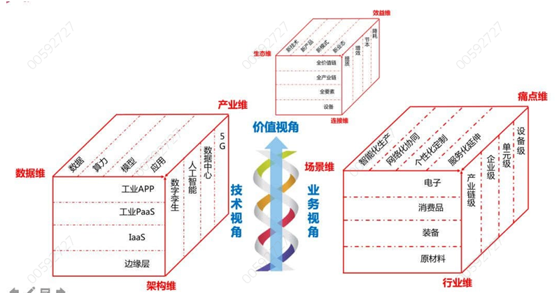 基于雙螺旋模型,可以從三大視角九大維度來探究制造業(yè)數(shù)字化轉(zhuǎn)型。一是價(jià)值視角:連接維、效益維、生產(chǎn)維;二是技術(shù)視角:架構(gòu)維、產(chǎn)業(yè)維、數(shù)據(jù)維;三是業(yè)務(wù)視角:行業(yè)維、痛點(diǎn)維、場景維。