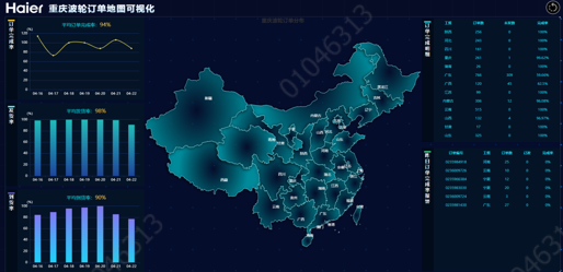訂單可視化地圖顯示訂單完成率,這里曲線圖展示近7日訂單的完成率,并在曲線圖上面顯示近七日平均訂單完成率;發(fā)貨率展示近7日的成品發(fā)貨完成率,并在柱形圖上面顯示;柱形圖上面顯示近7日平均到貨率;訂單完成明細(xì)可以展示當(dāng)天到每個(gè)省級工貿(mào)地,各自的訂單應(yīng)發(fā)數(shù)和未發(fā)數(shù),以及發(fā)貨完成率。昨日訂單完成率報(bào)警展示昨日發(fā)貨完率不及100%的列表信息,從左到右列表:訂單編號、工貿(mào)、訂單數(shù)、已發(fā)和完后率。地圖訂單分布點(diǎn)擊或者光標(biāo)放置到中國地圖某個(gè)省份,會(huì)出現(xiàn)該省份當(dāng)日訂單發(fā)貨信息。例如,光標(biāo)放置到山東省,會(huì)自動(dòng)彈出訂單發(fā)貨信息:訂單數(shù)、未發(fā)數(shù)和完成率。
