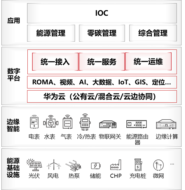 在技術方案方面,園區采用了最新的5G和WiFi6技術,實現園區無線網絡的全覆蓋。在園區廣泛部署智能物聯網關、智能攝像頭、能源路由器等邊緣智能設備,實現對園區人、車、物、能、碳等各種數據的全面采集。依托云、大、物、智等技術構建的數字平臺,對園區數據實現統一接入和匯聚、融合,對設備實現統一運維,對業務應用實現統一服務。綜合運營中心IOC實現園區各子系統的態勢感知、運營狀態可視化、業務分析和預警、決策支持和聯動指揮,實現對園區的智慧化管理。