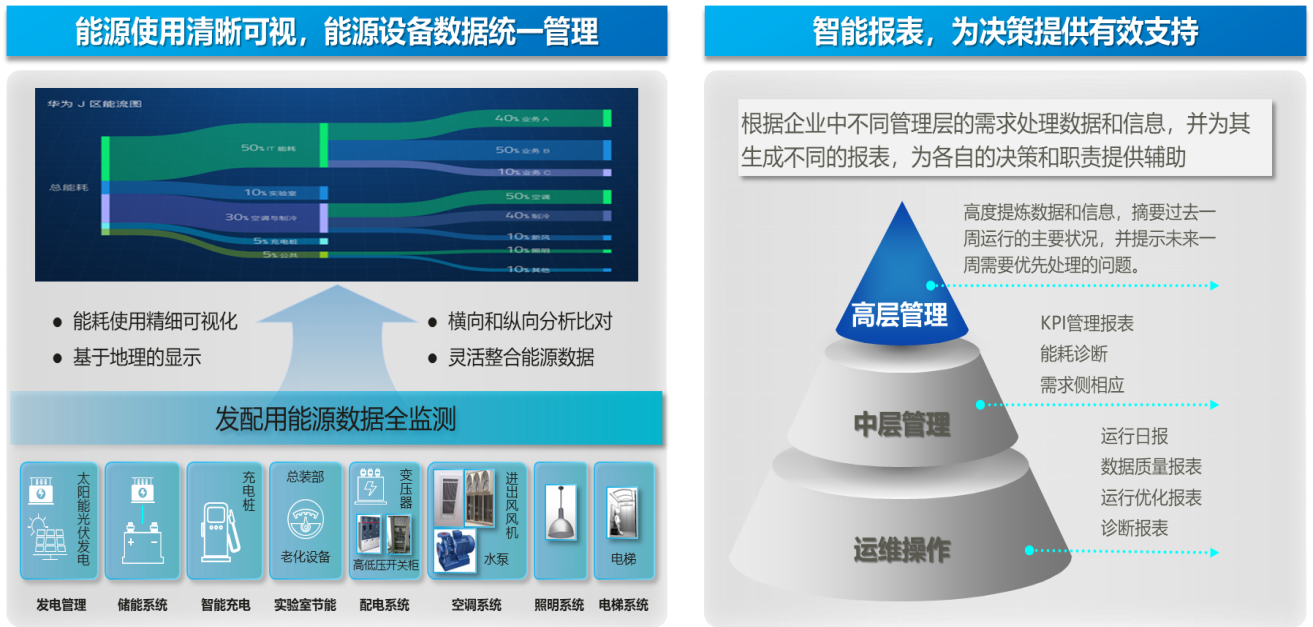 在園區碳排放管理方面,構建了一整套體系化、自動化、圖形化的碳排放管理系統,替換掉手工填報維護的方案,直觀地從各個維度進行碳排放分析和減碳趨勢分析。碳排放盤查功能提供按時間維度、業務維度(如部門、設備等)統計碳排放情況,用于各維度下的碳排放統計分析,為減碳決策提供數據支撐。統計報表以時間維度,統計所有登記設備的用能情況,并以報表方式呈現,通過與園區運營中心對接,完成統計報表或圖形展示。建立專項碳排放數據庫,對每階段的碳排放情況進行分析,將碳排放單位每階段(按日或月)的電耗、冷耗、熱耗、水耗等情況做成曲線圖,分析走勢,歸納總結。數據統計分析功能分析園區以及企業總體能耗情況、能源消耗單項指標、單位產品能耗情況、產值能耗情況、綜合能源產能情況、節能狀況、能源消費品種構成、能源消費結構等。