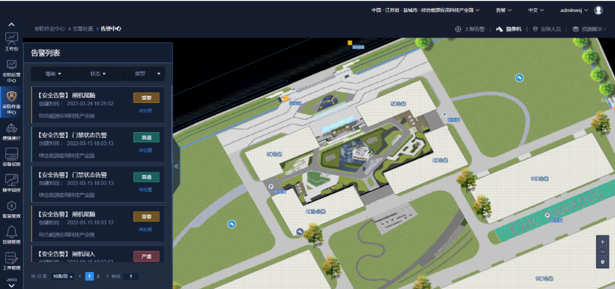 面向園區日常運營管理,通過園區數字平臺,將原本孤立的周界、門禁、消防、車輛、樓宇、群控、設施、資產、環境、辦公等業務子系統統一接入、匯聚、建模,將安防系統、物聯網系統相關系統等信息進行整合,形成數字孿生園區,立體呈現園區的整體情況,包括人員/車輛態勢、園區安防態勢、能源消耗情況、設施和資產運營態勢、環境和空間使用情況等,并通過聯動視頻監控系統、物聯網系統遠程查看和控制。