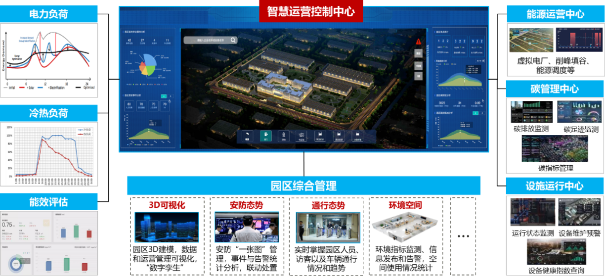 IOC作為零碳智慧園區系統的報告中心、指揮中心和統一入口,支撐園區能源、碳和綜合管理運營狀態可視化、業務分析和預警以及輔助決策和執行,實現園區能源、碳及綜合管理運營狀態的可視、可管、可控,完成園區數字化運營目標。